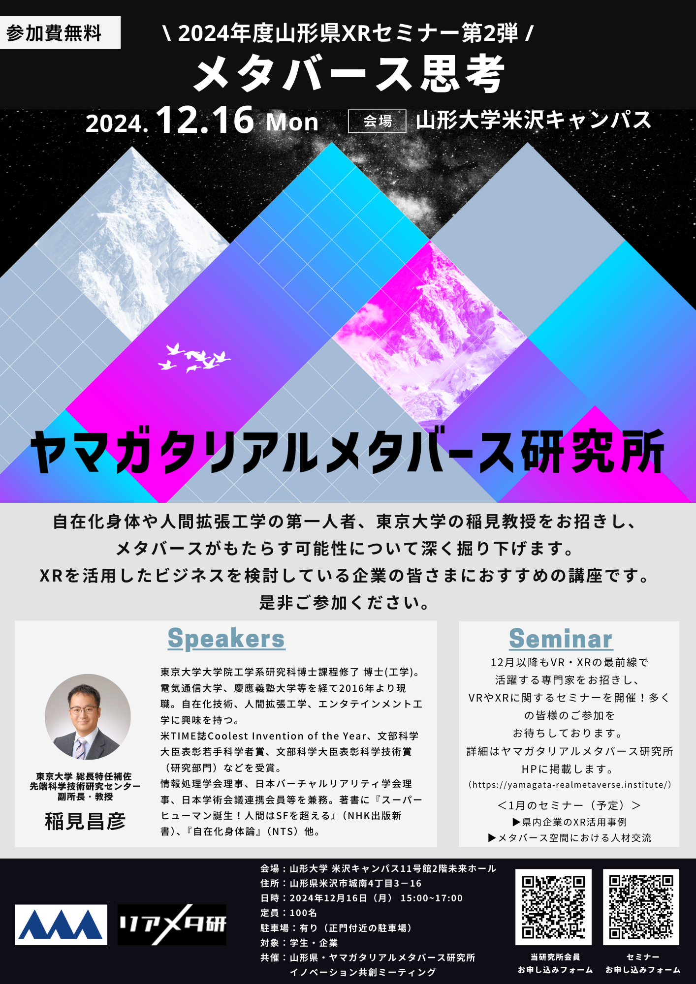 2024年12月16日に山形県米沢市にある山形大学米沢キャンパスにて「メタバース思考」のセミナーを開催します。