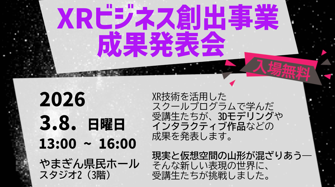 XR技術を活用したスクールプログラで学んだ受講生たちが、3Dモデリングやインタラクティブ作成などの成果を発表します。ぜひご参加ください!