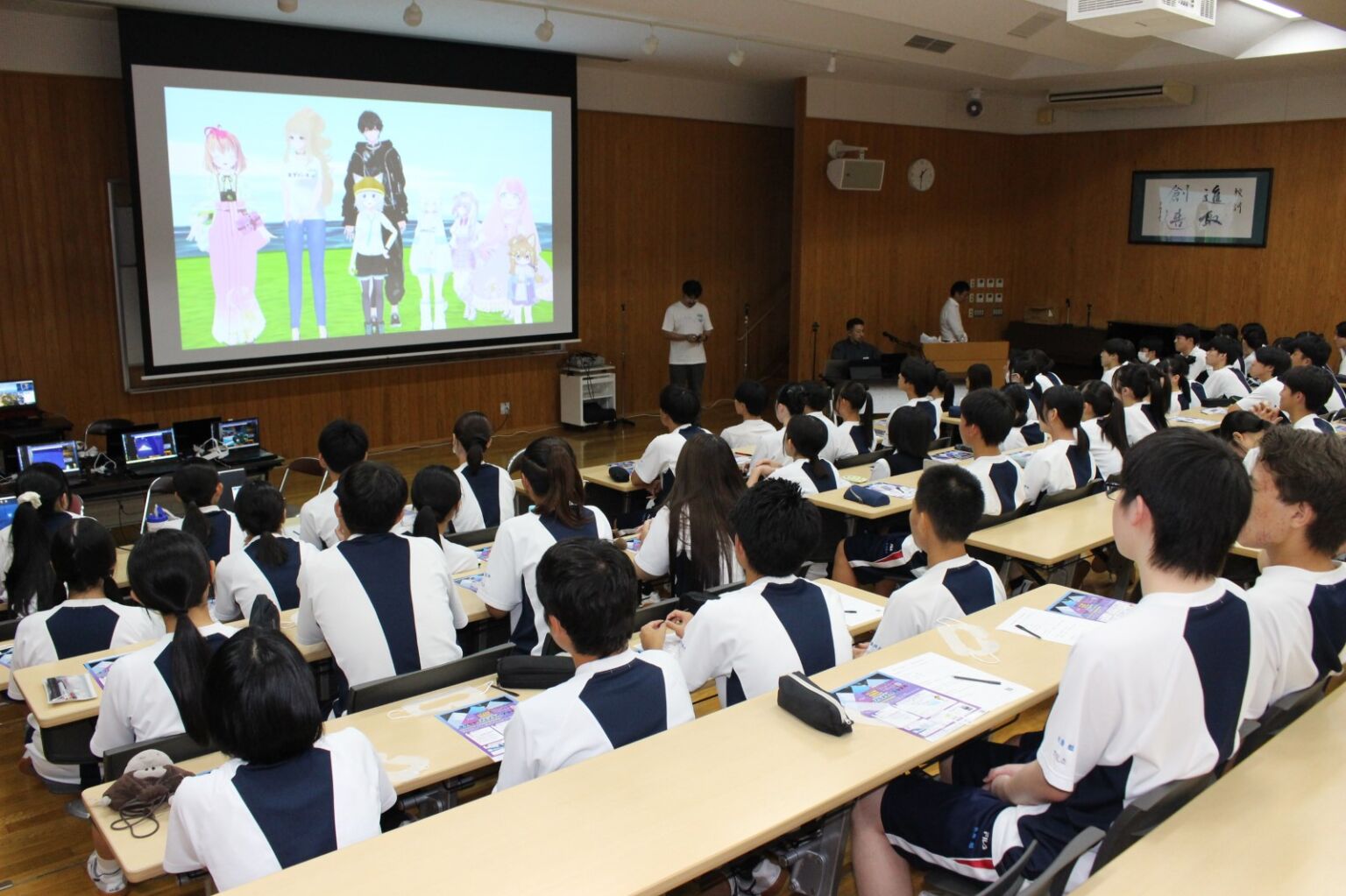体験会の目玉は、バーチャル空間で交流を楽しむVRChatです。VRゴーグルを装着した高校生たちは、3〜4人のグループに分かれ、VTuberの案内で「ワールド」と呼ばれるバーチャル空間を散策しました。